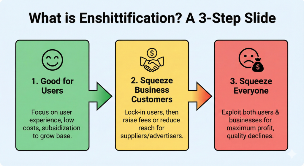 This term got popular thanks to Cory Doctorow (sci-fi writer + internet-rights guy who’s very good at naming ugly patterns). He describes a pretty consistent arc: platforms behave, then they don’t.